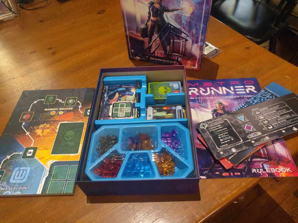 Metro Runner is the latest game from Thunderworks Games. I first came to Thunderworks when they did their first game called Roll Player, a dice drafting game about making a “D&D” character. After mentioning it here, I realize I need to do a review of that. It shall be my next game review.
