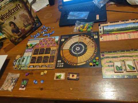 Woodcraft is primarily a rondel game. That big circle thing in the middle of the picture! There are 7 action tiles on the rondel, and on your turn you will choose one of them and slide the chosen tile to the next circular arc area. The options before you are always the same, but at times there are bonuses for actions that haven’t been taken yet. And those bonuses will entice you to take those actions.