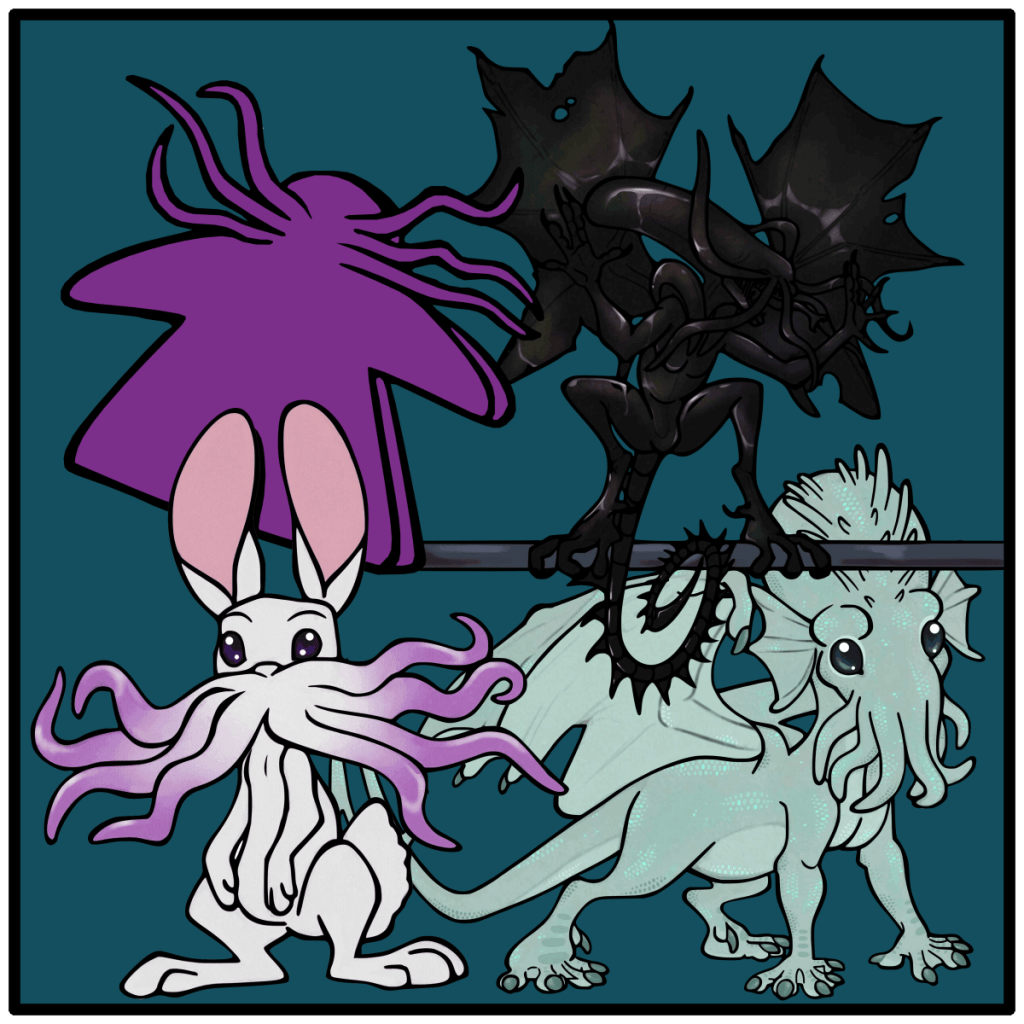 We have a newly redesigned version of Little Bunny Cthulhu for the horror portion of the site. Little Dragon Cthulhu for the fantasy side. Little Xeno Cthulhu for the sci-fi aspects. And Little Meeple Cthulhu for the boardgaming posts. I’ll let you suss out which is which.